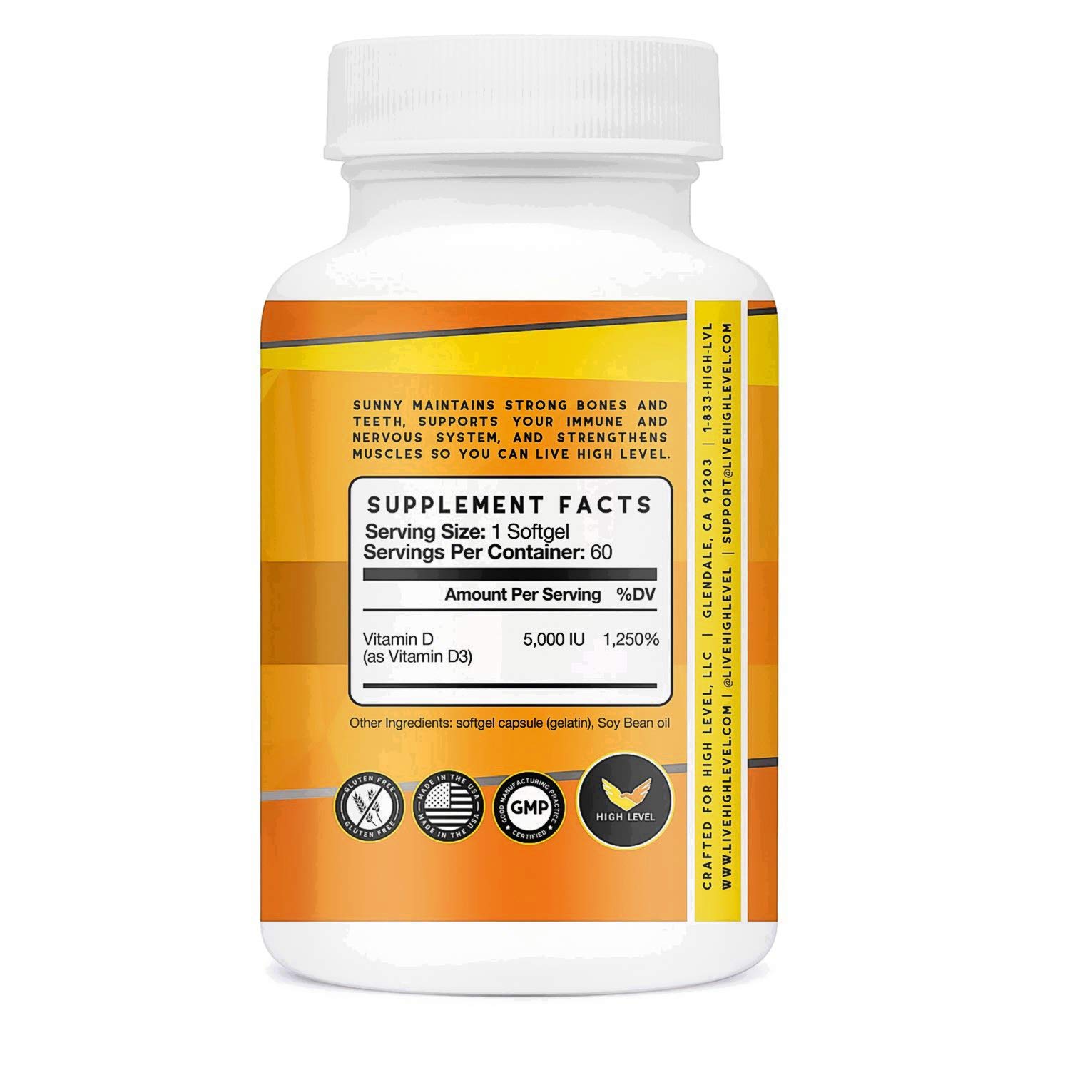 Vitamin D3 5000 Iu High Level Sunny 60 Softgels High Potency Strong Bones Teeth Immune