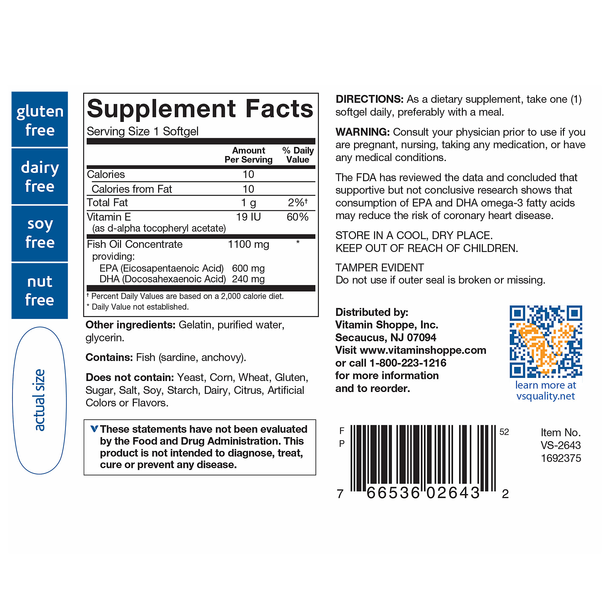 The Vitamin Shoppe Omega 3 Fish Oil 1100mg Epa 600mg Dha 240mg Purity Assured Molecularly Distilled To Support Cardiovascular Joint And Brain