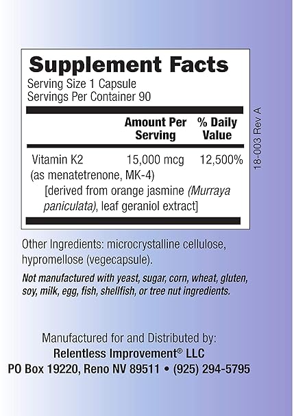 Relentless Improvement Vitamin K2 Menatetrenone Mk 4 15mg Per Vegecapsule 90ct