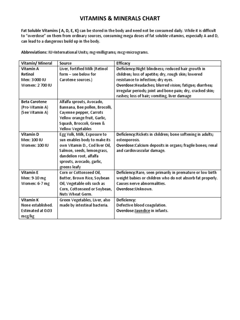 Vitamins And Minerals Chart Pdf Vitamin Deficiency