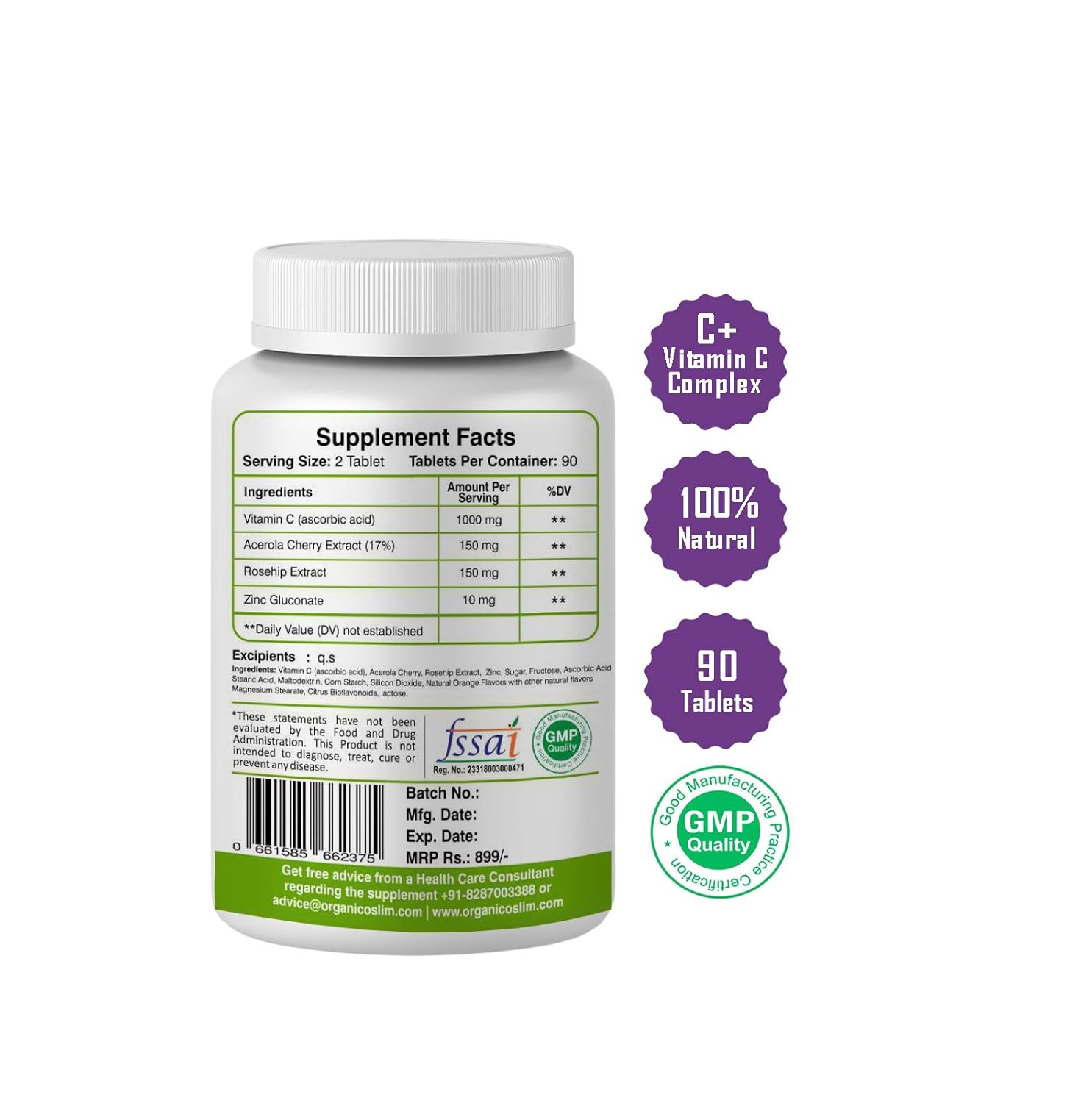 Organicoslim Vitamin C Complex 1000mg With Acerola Cherry And Rosehip Extract 90 Chewable Tablets