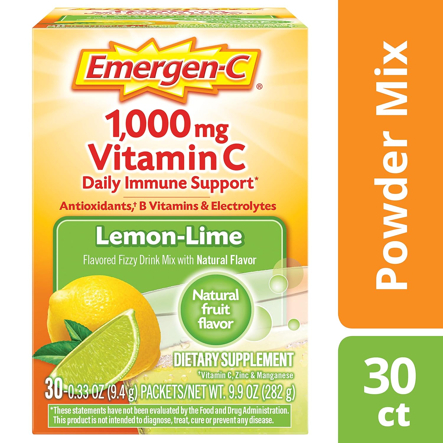 Emergen C 30 Count Lemon Lime Flavor 1 Month Supply Dietary Supplement Fizzy Drink Mix With 1000mg Vitamin C 0 33 Ounce Powder Packets Caffeine
