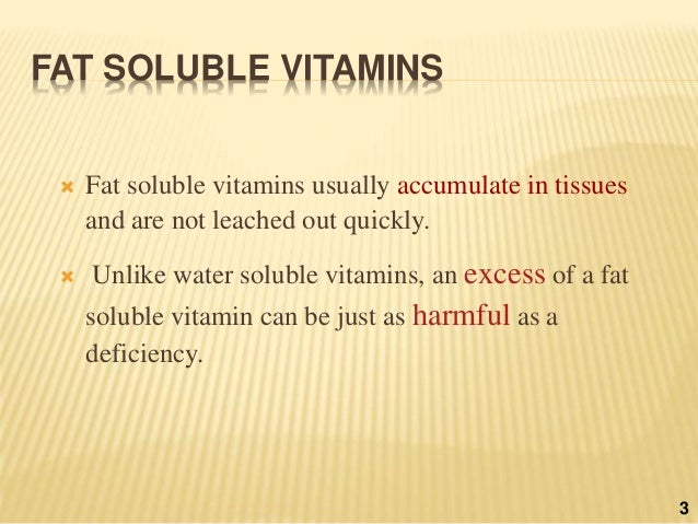 Unlike water soluble vitamins that need regular replacement in the body fat soluble vitamins are stored in the liver and fatty tissues and are eliminated much more slowly than water soluble vitamins. Generally fat soluble vitamins will be found in foods such as. Acharya on overconsumption of the fat soluble vitamins results in.