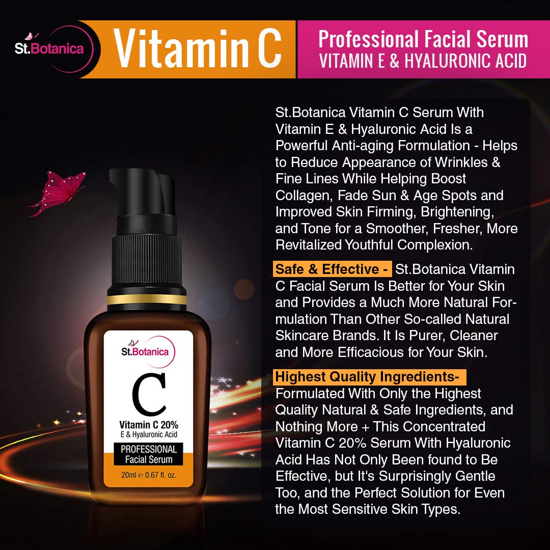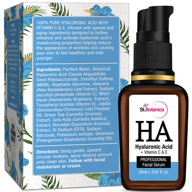 Where many celebrities are getting hyaluronic injections to get youthful skin stbotanica has brought into the indian market an extremely promising and effective serum which not only contains hyaluronic acid but also vitamin e and vitamin c. Botanica vitamin c 20 vitamin e and hyaluronic acid fairness brightening facial serum. Stbotanica vitamin c serum with vitamin e hyaluronic acid is a powerful anti aging formulation helps to reduce appearance of wrinkles fine lines while helping boost collagen fade sun age spots and improved skin firming brightening and tone for a smoother fresher more revitalized youthful complexion.