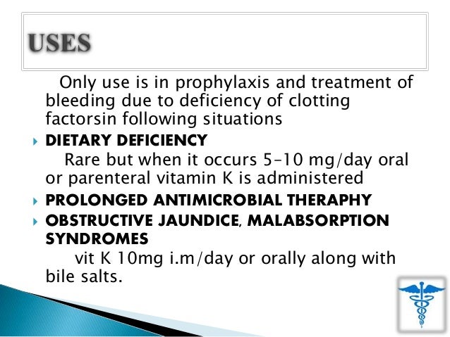 Unlike many other vitamins vitamin k is not typically used as a dietary supplement. Vitamin k1 injection phytonadione injectable emulsion usp is indicated in the following coagulation disorders which are due to faulty formation of factors ii vii ix and x when caused by vitamin k deficiency or interference with vitamin k activity. Vitamin k was accidentally discovered in the 1920s and 1930s after restricted diets in animals led to excessive bleeding.