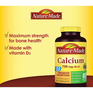 1 each serving of nature made calcium 750mg with vitamins d and k provides 750 mg of calcium 500 iu of vitamin d 3 and 40 mcg of vitamin k to support healthy bones. Adequate calcium is important for teens young adults and post menopausal women. Each tablet delivers 750 mg of calcium 500 ius of vitamin d 3 for calcium absorption and 40 mcg of vitamin k for bone health supportnature made calcium 750 mg with vitamins d and k is guaranteed to meet our high quality standards it is made from carefully selected ingredients under strict manufacturing processes.