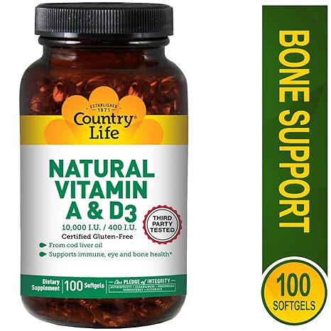 Country Life Gluten Free Natural Vitamin A D3 10 000 Iu 400 Iu 100 Softgels